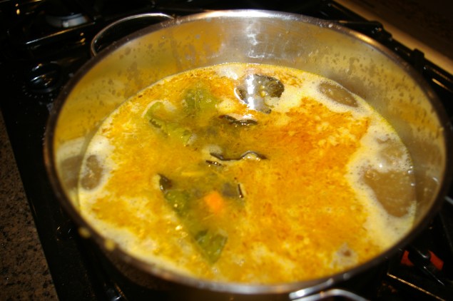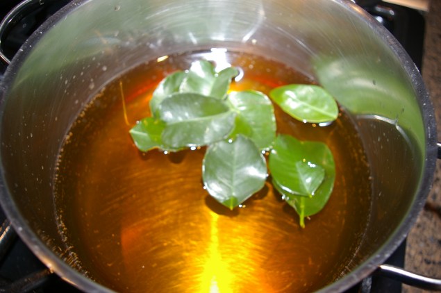 1. Heat the stock while preparing ingredients. Add the lime leaves and keep warm.
