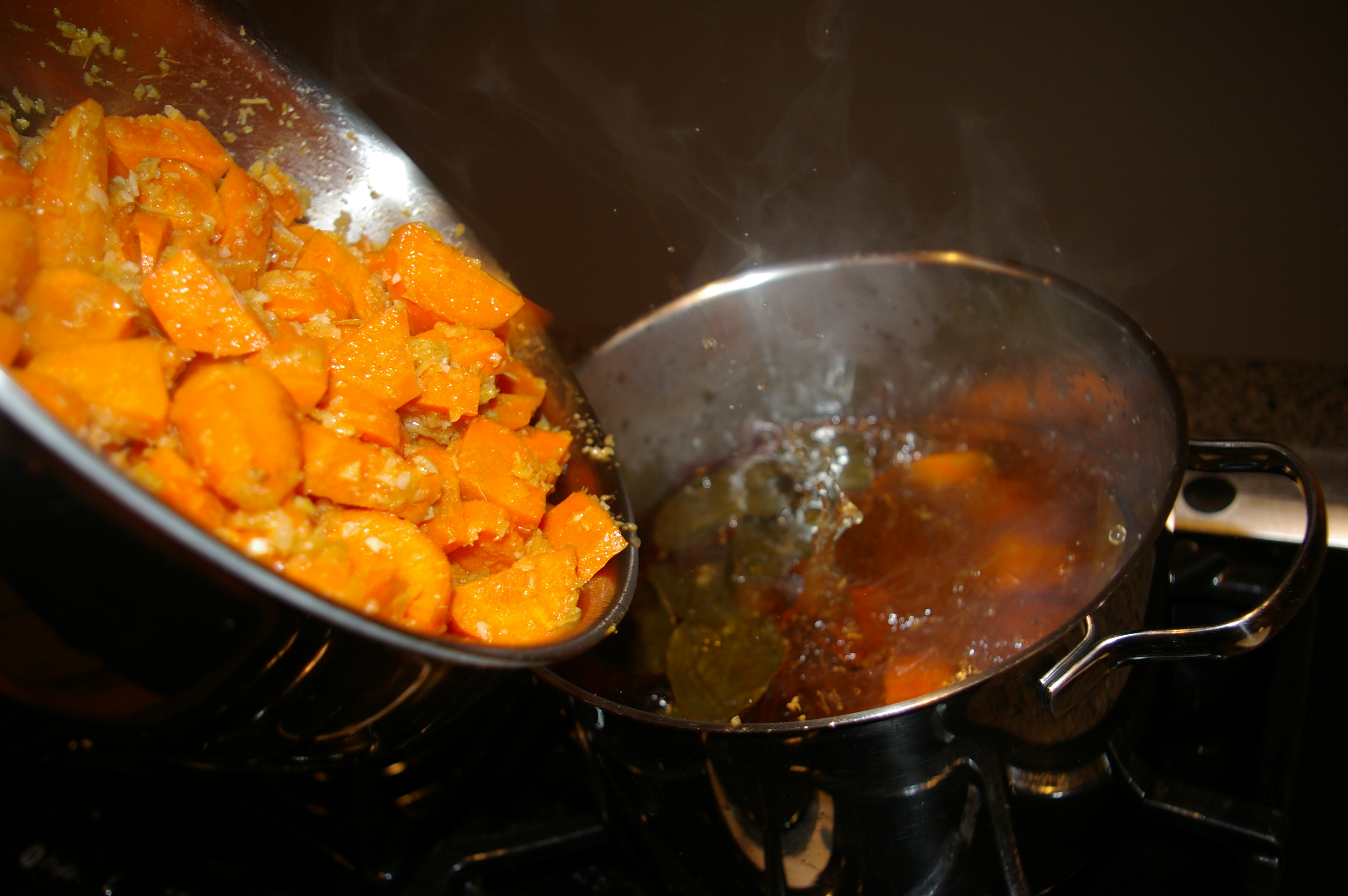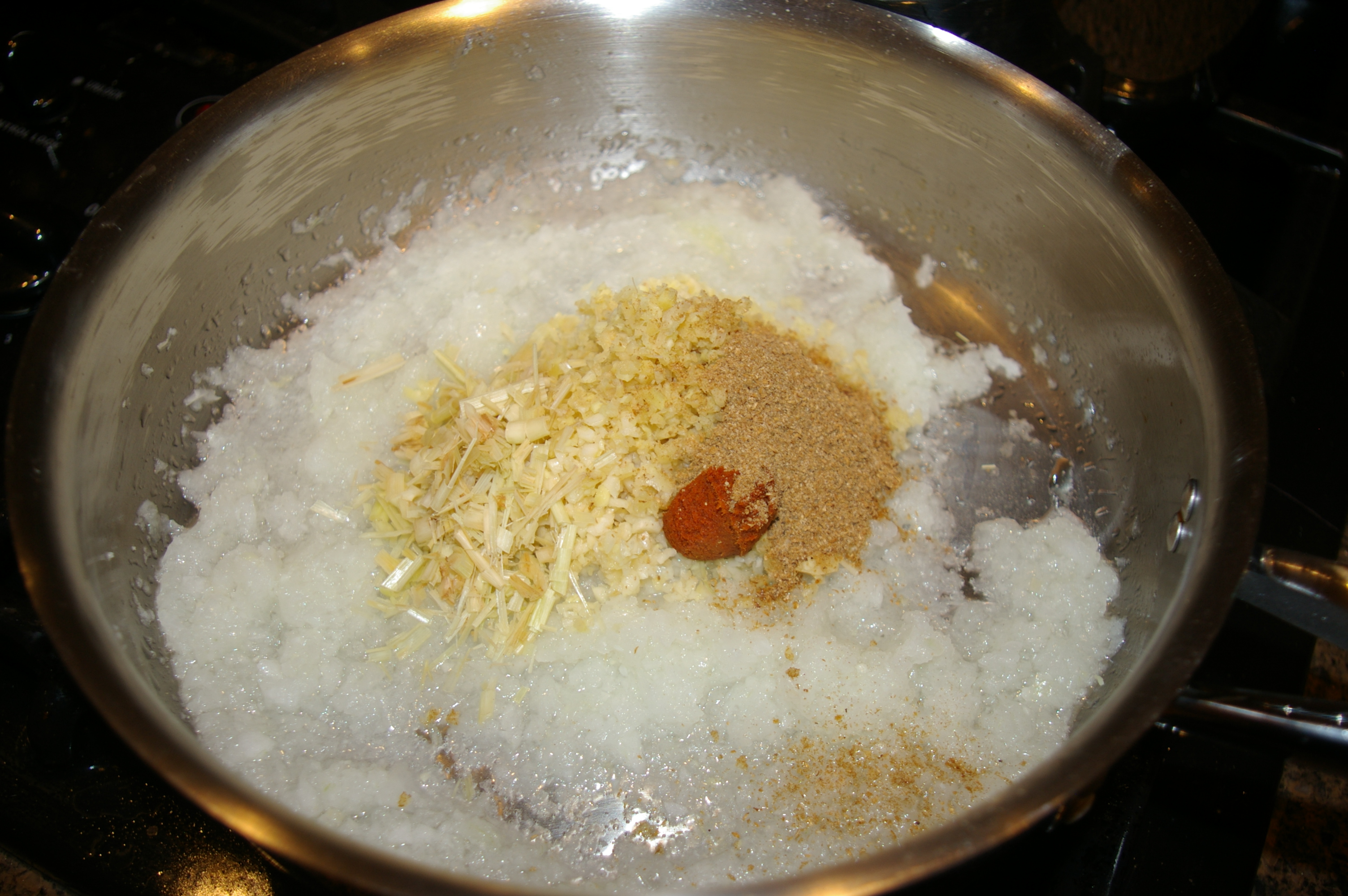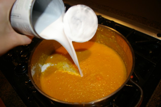 3. Heat oil add onion and salt and cook until onions translucent. Then add garlic, ginger, lemongrass, curry paste and coriander, saute and stir 5 minutes. Stir in chopped carrots and remaining salt, sauté for several minutes then pour into hot stock. Bring to a boil and simmer until carrots are soft