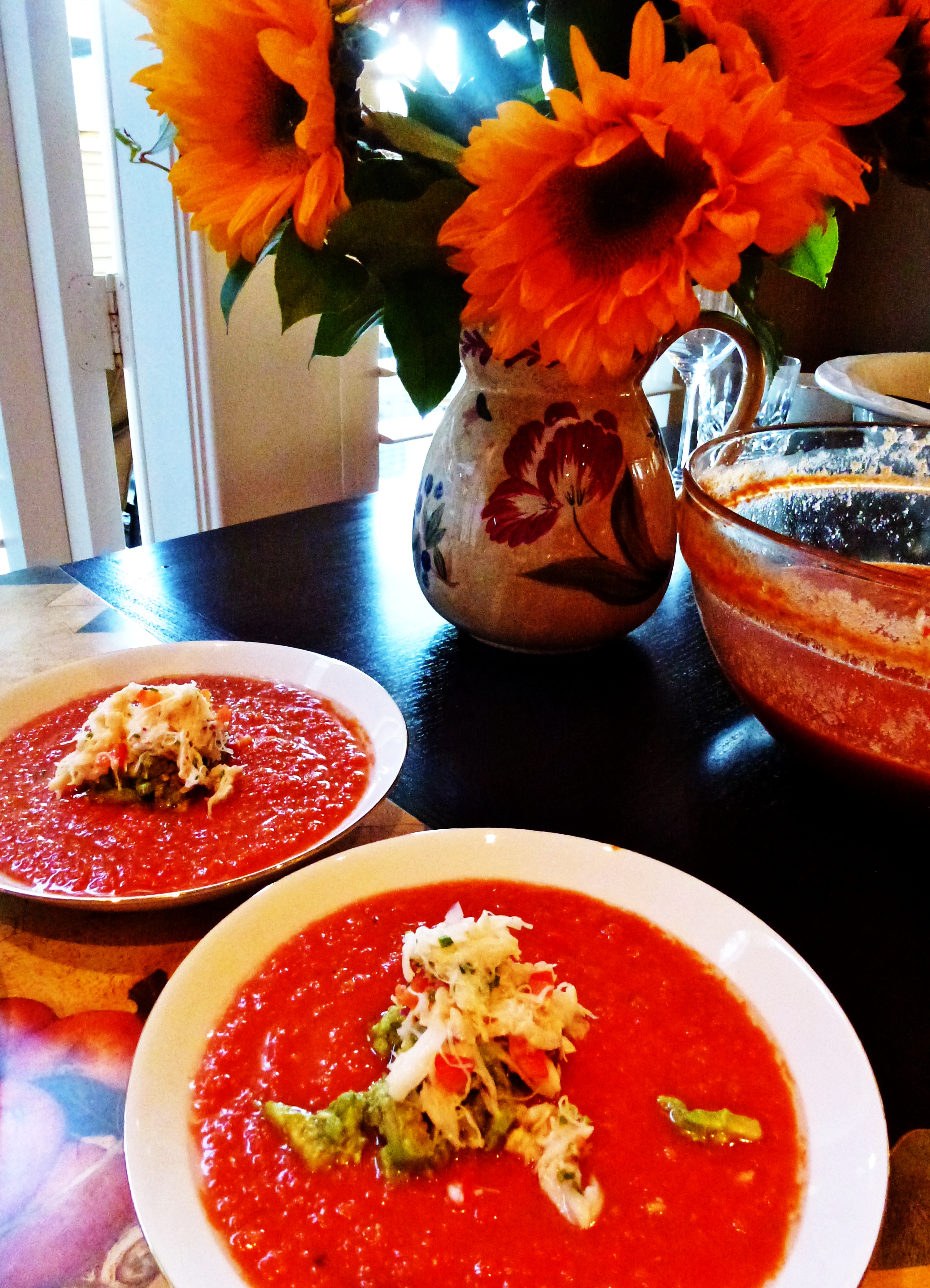 7. To serve, place gazpacho in bowl, top with avocados followed by crab and garnish with finely chopped chives.