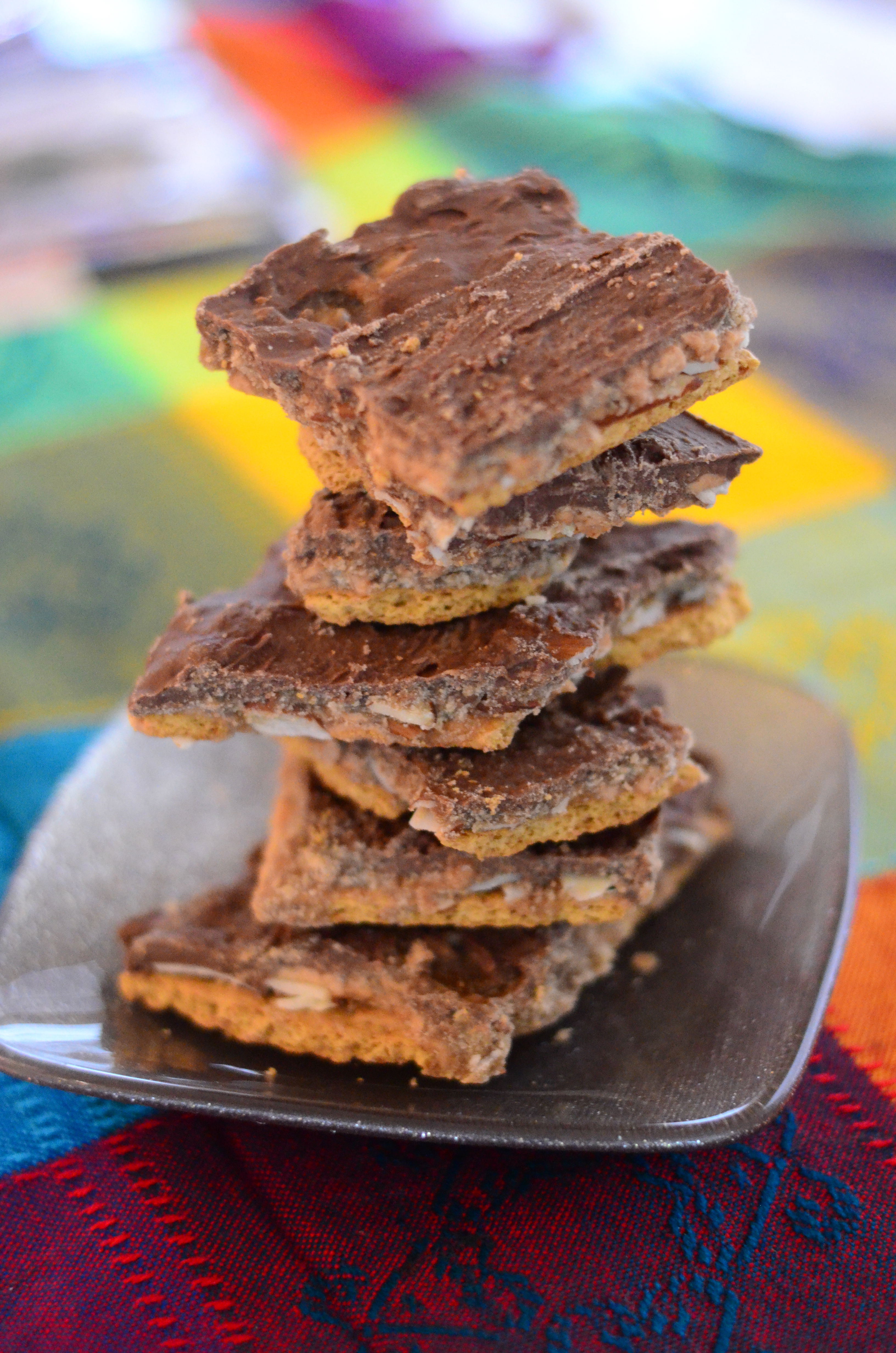 Line a cookie sheet with foil. Cover with graham wafers, trimming some to fit.