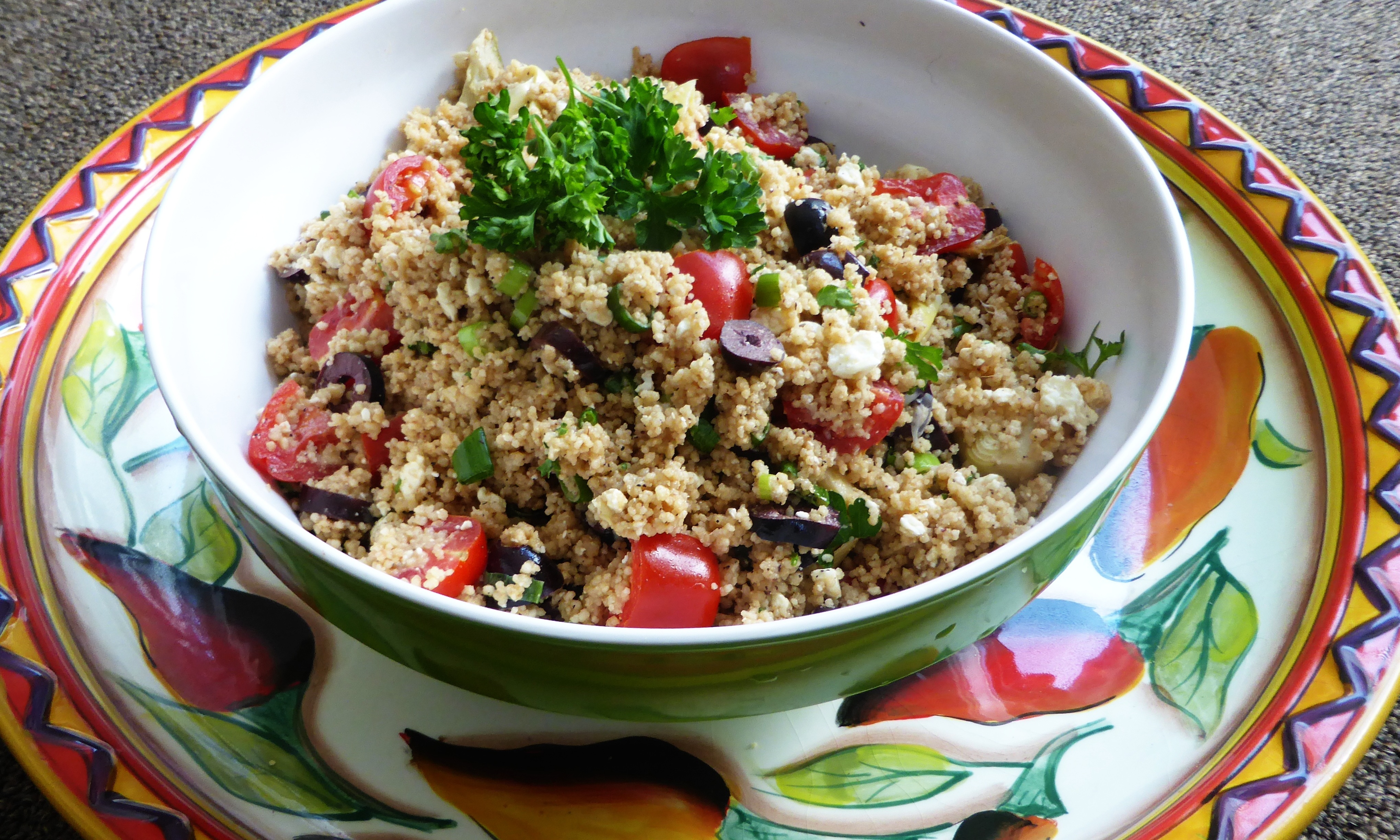 3. Add tomatoes, feta cheese, onions, olives, artichokes and parsley to couscous. Stir to mix.