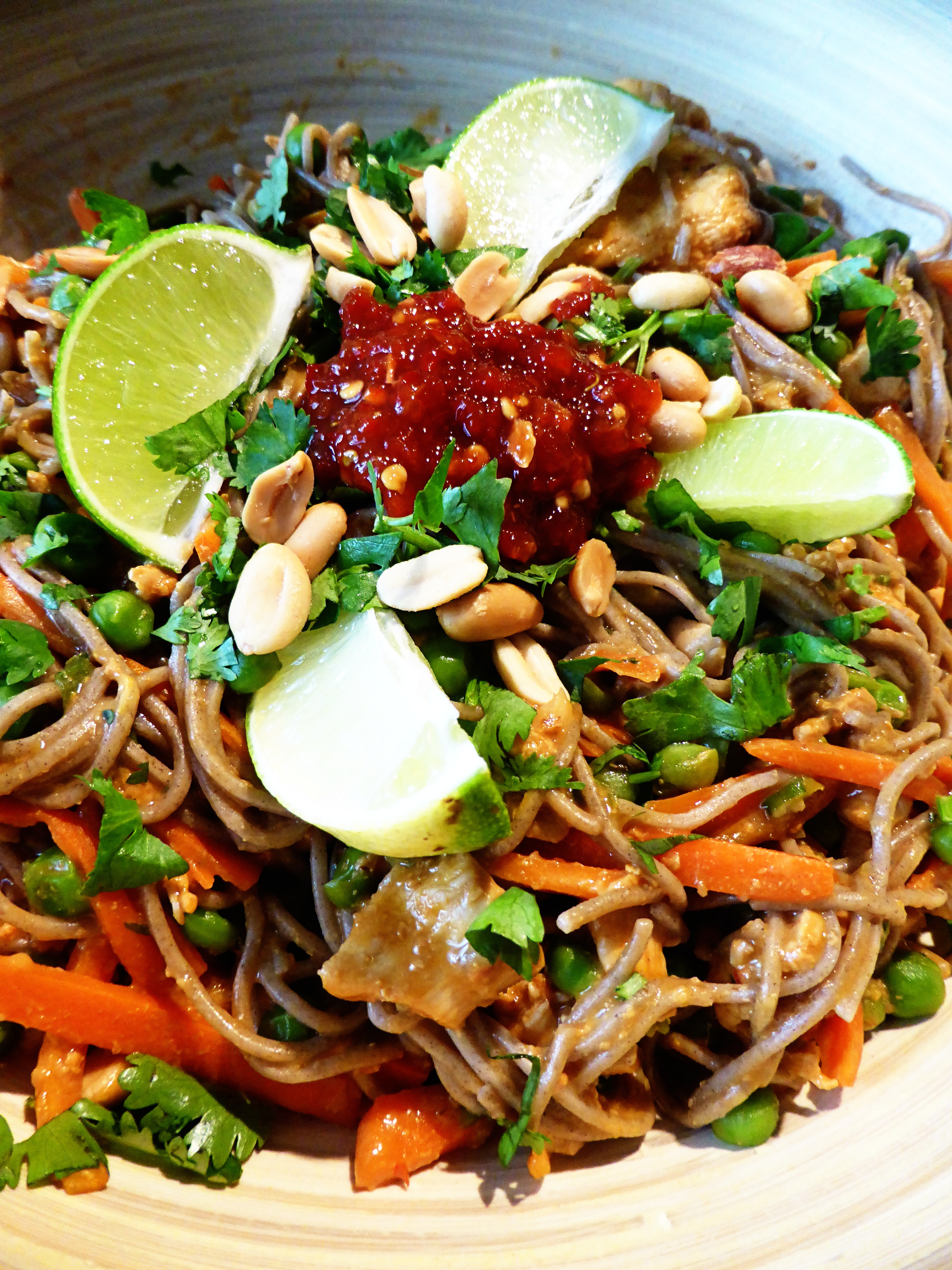 2. To make the peanut sauce combine the peanut butter, soy sauce, ginger, rice vinegar, sesame oil, honey, sweet chili sauce, garlic and 2/3 a cup hot water and mix till smooth. Set aside.